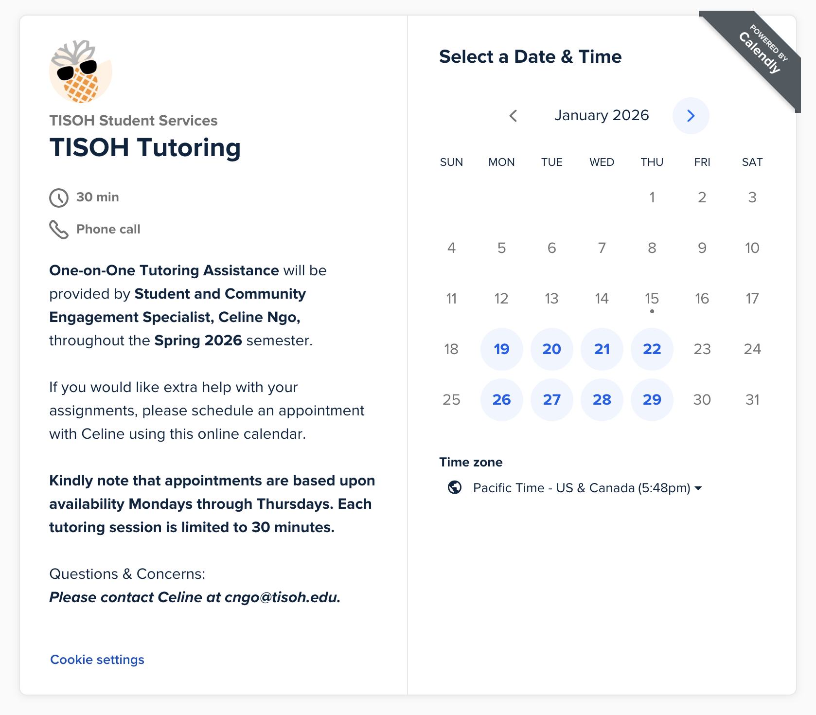 Please note: Tutoring Session Appointments must be made at minimum 24 hours in advance